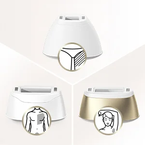 Dieses IPL-Gerät enthält einen Präzisionsaufsatz für kleinere, empfindliche Bereiche wie Gesicht und Bikinizone, einen Standardaufsatz, der sich ideal für die Achselhöhlen eignet, und einen breiten Aufsatz für größere Körperbereiche wie Brust oder Oberschenkel.